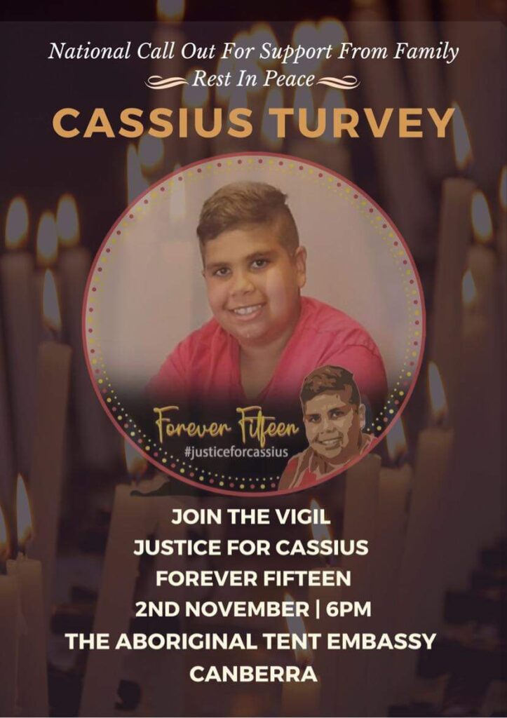 Vigil for Cassis Turvey: Embassy, 6pm on Wednesday 2 November. Cassius died after being assaulted in Perth and people will gather at vigils around Australia to demand justice for Cassius. ABC News: Cassius Turvey – Indigenous families on edge after teen death.